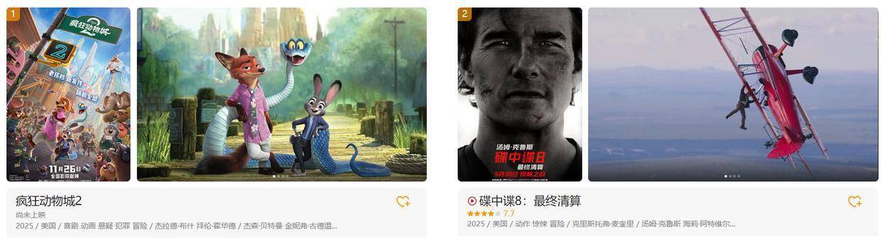 据国内的某电影平台所显示,《疯狂动物城2》在2025年最值得期待外语电影中处于第一名,汤姆克鲁斯的《碟中谍8》、詹姆斯卡梅隆的《阿凡达3》和《惊天魔盗团3》等,都位列其后。