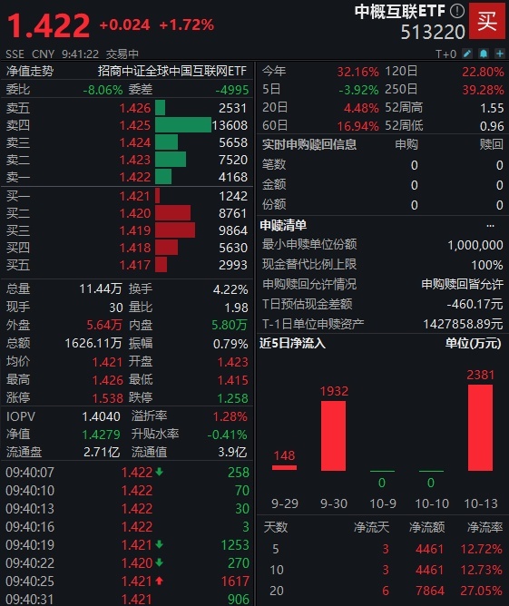 相关ETF方面,中概互联ETF(513220)高开高走,截至发稿涨超1.7%,Wind数据显示,中概互联ETF(513220)10月13日“吸金”2381万,近五个交易日“吸金”超4400万元,年内份额增幅超54.82%。据统计,在同赛道的四只ETF标的中,中概互联ETF(513220)亦是年内份额唯一呈现正增长的产品。